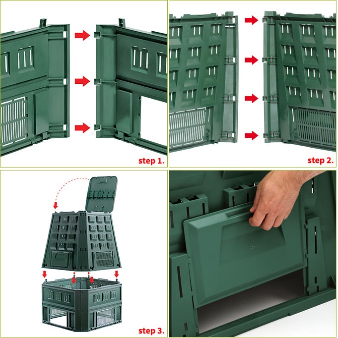 Plastový kompostér s využiteľným objemom 750l z rady Evergreen. Je vybavený praktickým vekom a spodnými dvierkami pre jednoduché plnenie organickým materiálom ako aj vyberaním hotového kompostu. Malé otvory zabezpečujú cirkuláciu vzduchu. Farba čierna.