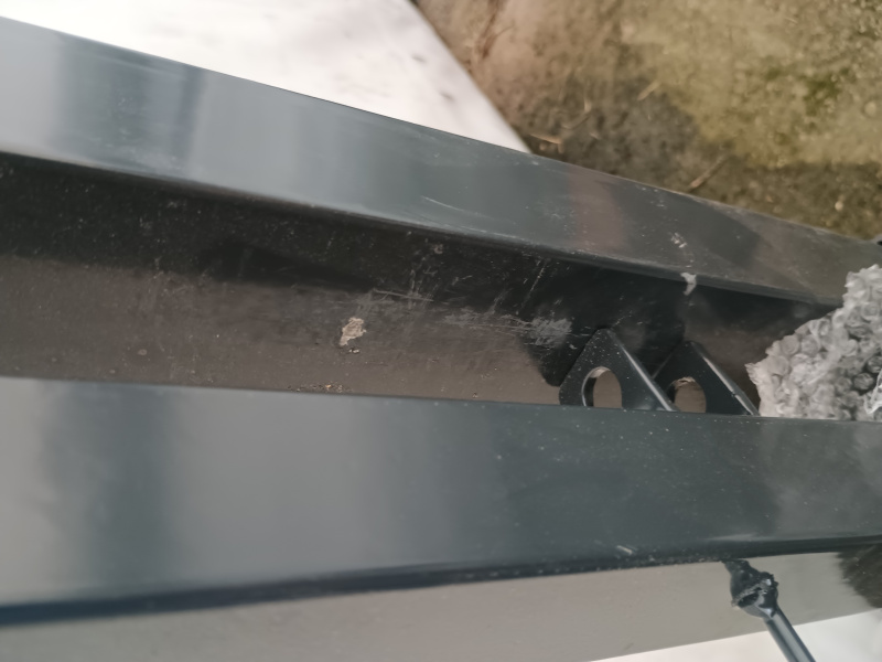Bránka je mierne odretá v na nosnom stĺpiku na úrovni spodného pántu a na dorazovom stĺpiku na úrovni zámku. Výplň je mierne prehnutá.