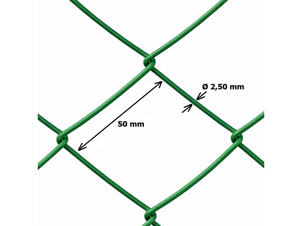 Klasické splietané štvorhranné pletivo, veľkosť oka 50x50 mm, výška 100 cm, hrúbka drôtu 2,5 mm. Pletivo je vyrobené z pozinkovaného a poplastovaného drôtu. Farba zelená.