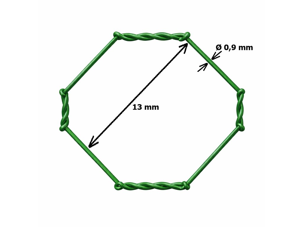 Chovateľské pletivo šesťhranné, veľkosť oka 13×13 mm, výška 100 cm, hrúbka drôtu 0,90 mm. Pletivo je vyrobené z poplastovaného drôtu a následne zapletené.