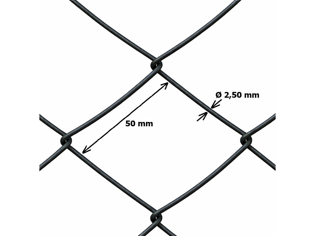 Klasické splietané štvorhranné pletivo, veľkosť oka 50x50 mm, výška 125 cm, hrúbka drôtu 2,5 mm. Pletivo je vyrobené z pozinkovaného a poplastovaného drôtu. Farba antracitová šedá.