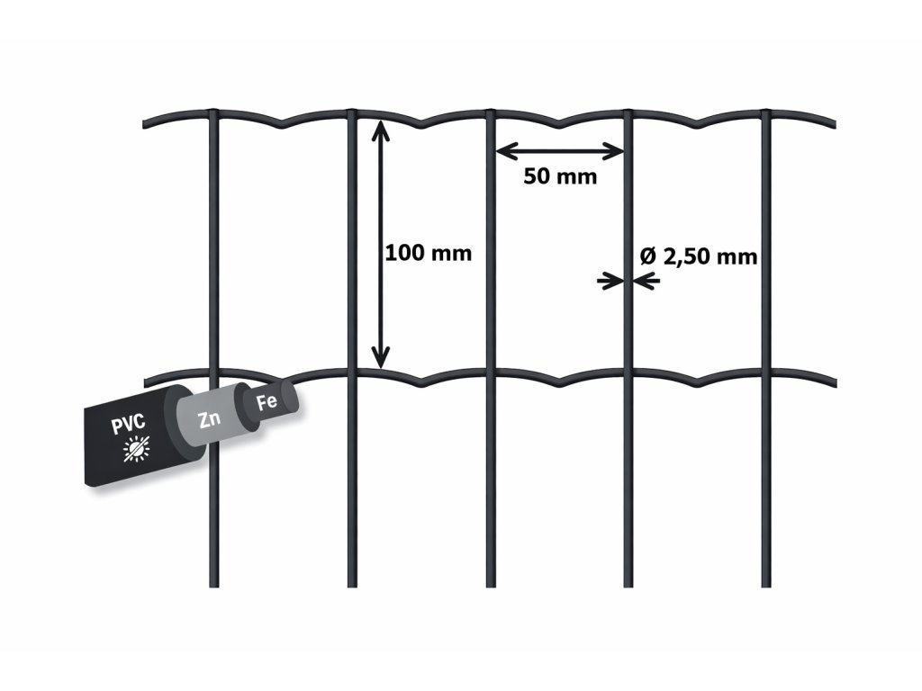 Zvárané ohradové pletivo, veľkosť oka 100x50 mm, výška 60 cm, hrúbka drôtu 2,5 mm. Pletivo je vyrobené z pozinkovaného a poplastovaného drôtu. Farba antracitová. Pletivo nemá hore a dole zdvojené/strojené drôty.