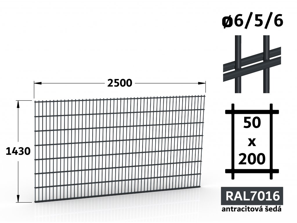 Šírka panelu 250 cm, výška panelu 143 cm, priemer vertikálného drôtu 5 mm, priemer horizontálnych drôtov 6 mm, vnútorná šírka oka 50 mm. Pozinkovaný + poplastovaný, antracitová farba.