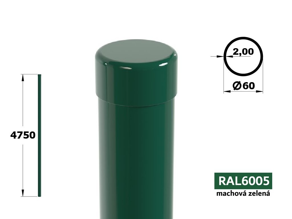 Plotový stĺpik 475 cm, priemer 60 mm, hr. steny 2,00 mm, machová zelená