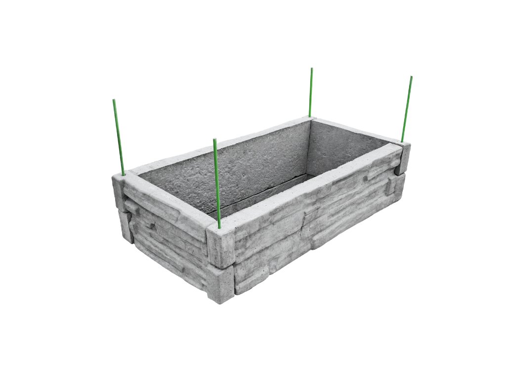 Vyvýšený betónový záhon s rozmermi 100 x 50 cm na výšku 25 cm so vzorom štiepaného kameňa v prírodnej šedej farbe. Záhon sa skladá z 2 ks betónových záhonových dosiek s rozmermi 100 x 25 x 5 cm a z 2 ks betónových záhonových dosiek s rozmermi 50 x 25 x 5 cm.