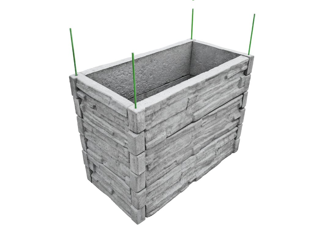 Vyvýšený betónový záhon s rozmermi 100 x 50 cm na výšku 25 cm so vzorom štiepaného kameňa v prírodnej šedej farbe. Záhon sa skladá zo 6 ks betónových záhonových dosiek s rozmermi 100 x 25 x 5 cm a zo 6 ks betónových záhonových dosiek s rozmermi 50 x 25 x 5 cm.