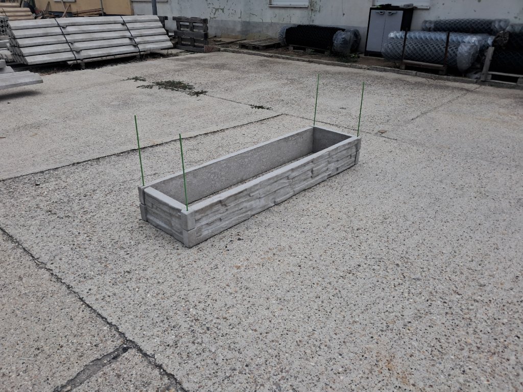 Vyvýšený betónový záhon s rozmermi 200 x 50 cm na výšku 25 cm so vzorom dreva v antracitovej farbe. Záhon sa skladá z 2 ks betónových záhonových dosiek s rozmermi 200 x 25 x 5 cm a z 2 ks betónových záhonových dosiek s rozmermi 50 x 25 x 5 cm.