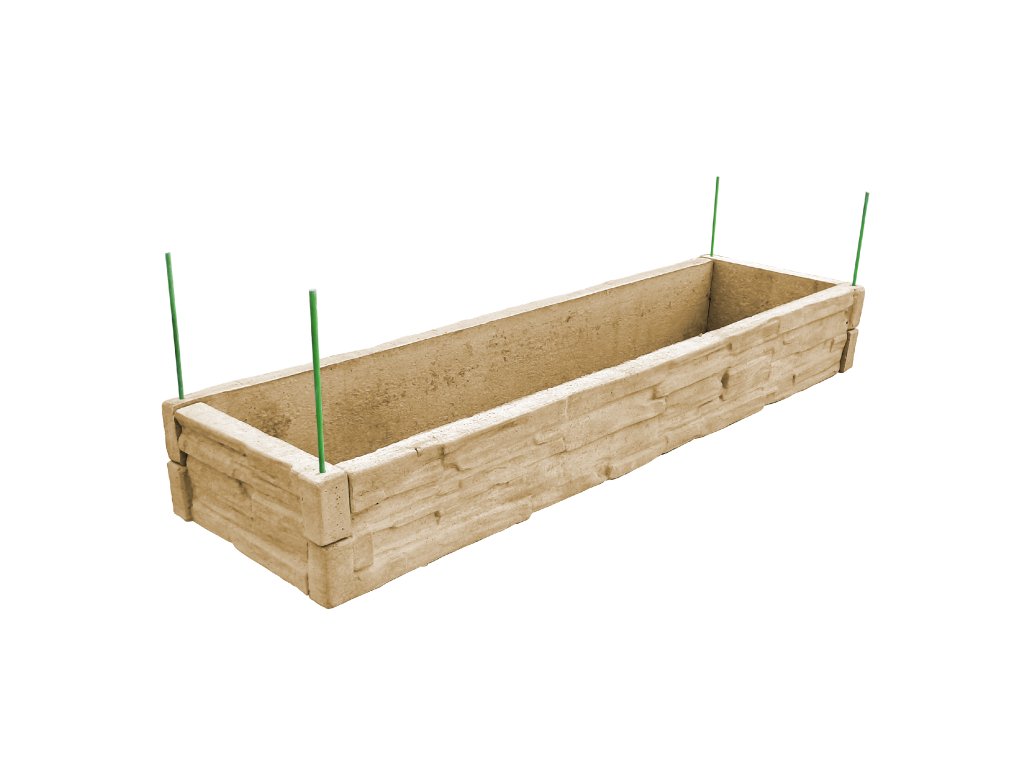 Vyvýšený betónový záhon s rozmermi 200 x 50 cm na výšku 25 cm so vzorom štiepaného kameňa v pieskovcovej farbe. Záhon sa skladá z 2 ks betónových záhonových dosiek s rozmermi 200 x 25 x 5 cm a z 2 ks betónových záhonových dosiek s rozmermi 50 x 25 x 5 cm.