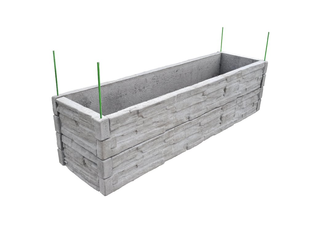 Vyvýšený betónový záhon s rozmermi 200 x 50 cm na výšku 50 cm so vzorom štiepaného kameňa v prírodnej šedej farbe. Záhon sa skladá zo 4 ks betónových záhonových dosiek s rozmermi 200 x 25 x 5 cm a zo 4 ks betónových záhonových dosiek s rozmermi 50 x 25 x 5 cm.