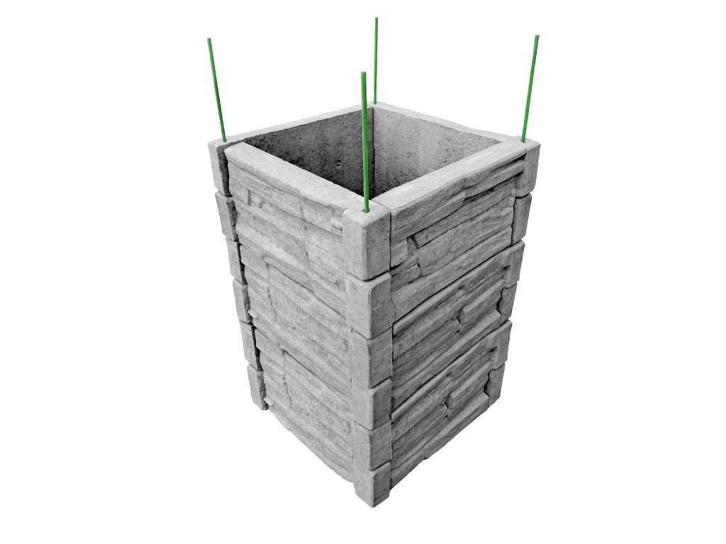 Vyvýšený betónový záhon s rozmermi 50 x 50 cm na výšku 75 cm so vzorom štiepaného kameňa v prírodnej šedej farbe. Záhon sa skladá z 12 ks betónových záhonových dosiek s rozmermi 50 x 25 x 5 cm.